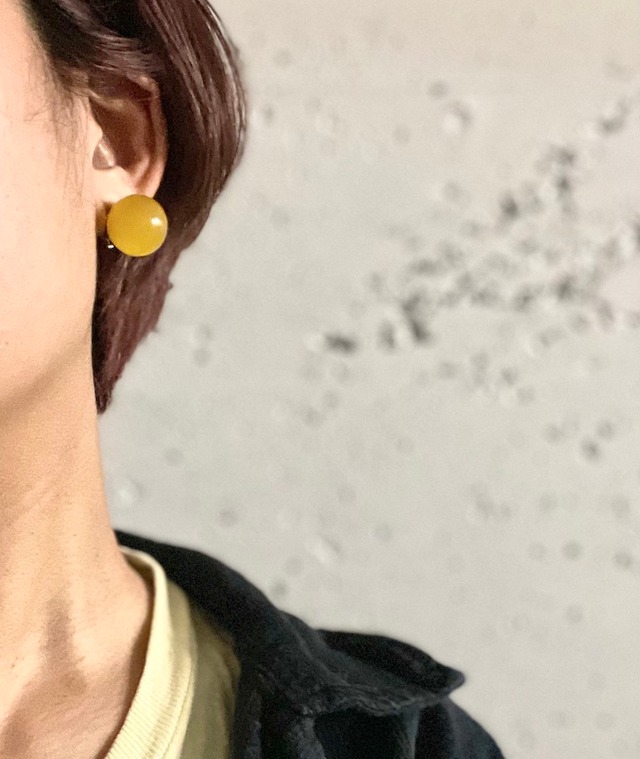 ころんとしたバター飴みたいな美味しそうなイヤリング。 1907年にベルギーのレオ・ベークランド氏が発明した世界初の人口プラスチック、ベークライト。 優れた耐熱性と加工のしやすさなどから、キッチン用品やジュエリーに重宝されました。 製造過程が危険であったことや、高性能の新しい硬化プラスチックの誕生に伴い、1960年代半ばには姿を消してしまいます。 今は製造されない、貴重なジュエリーです。 古物ではありますが、金具のホールド感はバッチリです。 存在感もバッチリですので、スタイリングのアクセントに。 【カラー】 イエロー 【素材】 ベークライト 【コンディション】 良好ですが、小傷が少し見られます。 古物ですので、ご了承くださるようお願いいたします。 【サイズ】 約2㎝