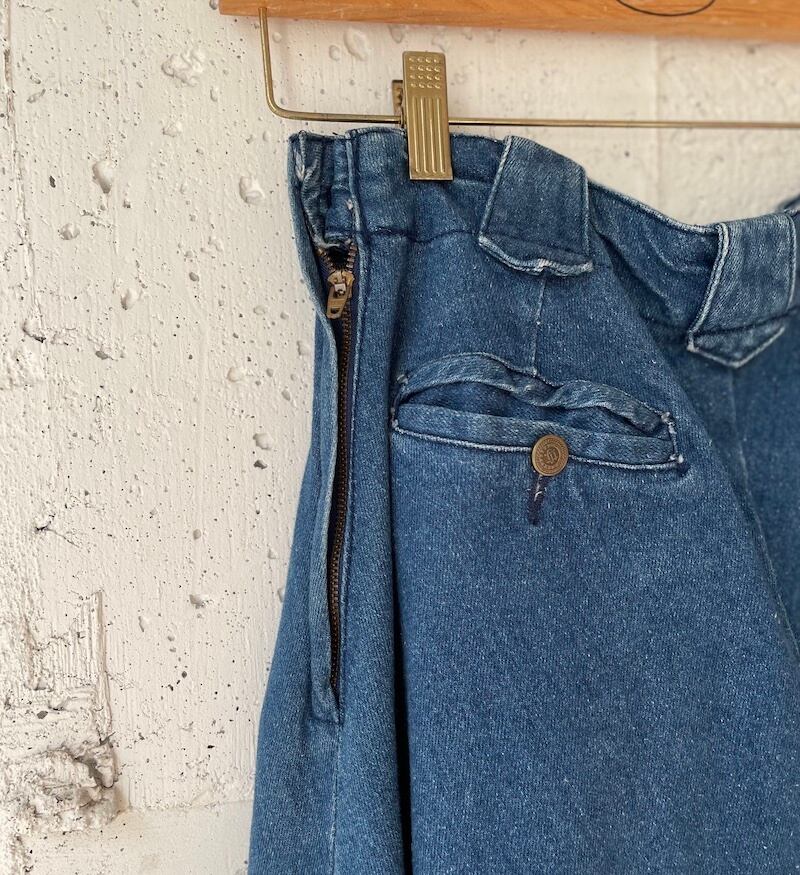 デニムのフレアスカート。バイアス方向に生地が使われています。裾に向かってたっぷりの生地が使われている分、綺麗なドレープが出て◎。ウエスタン調のベルトループもキュート。夏はジャストサイズのTシャツと、秋冬はざっくりニットやブーツと合わせて。オールシーズン使える優秀スカートです!