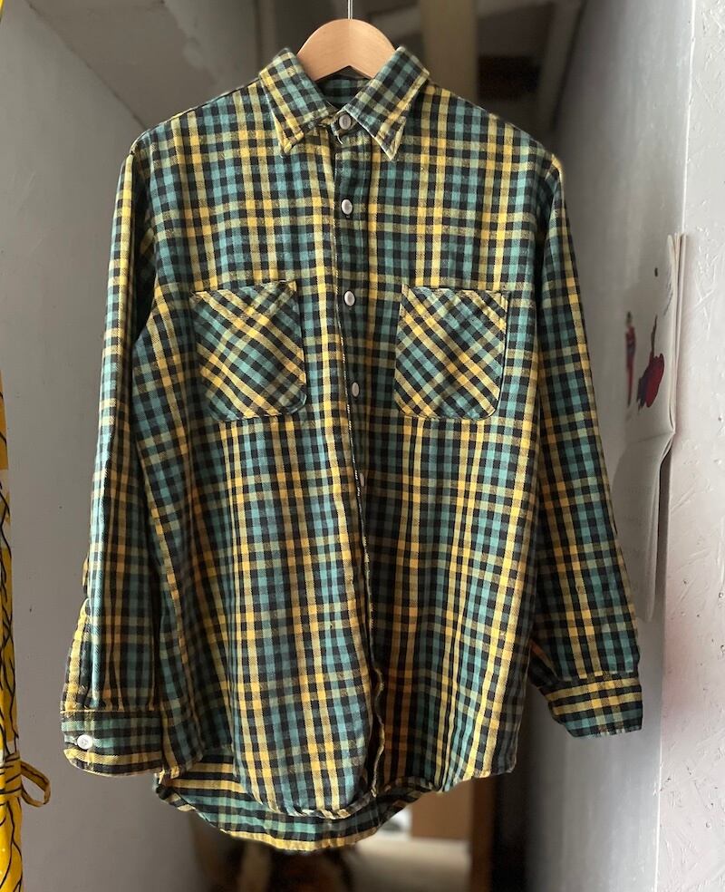 イエロー×ブルーグリーンの、わんぱくかわいいネルシャツです。
