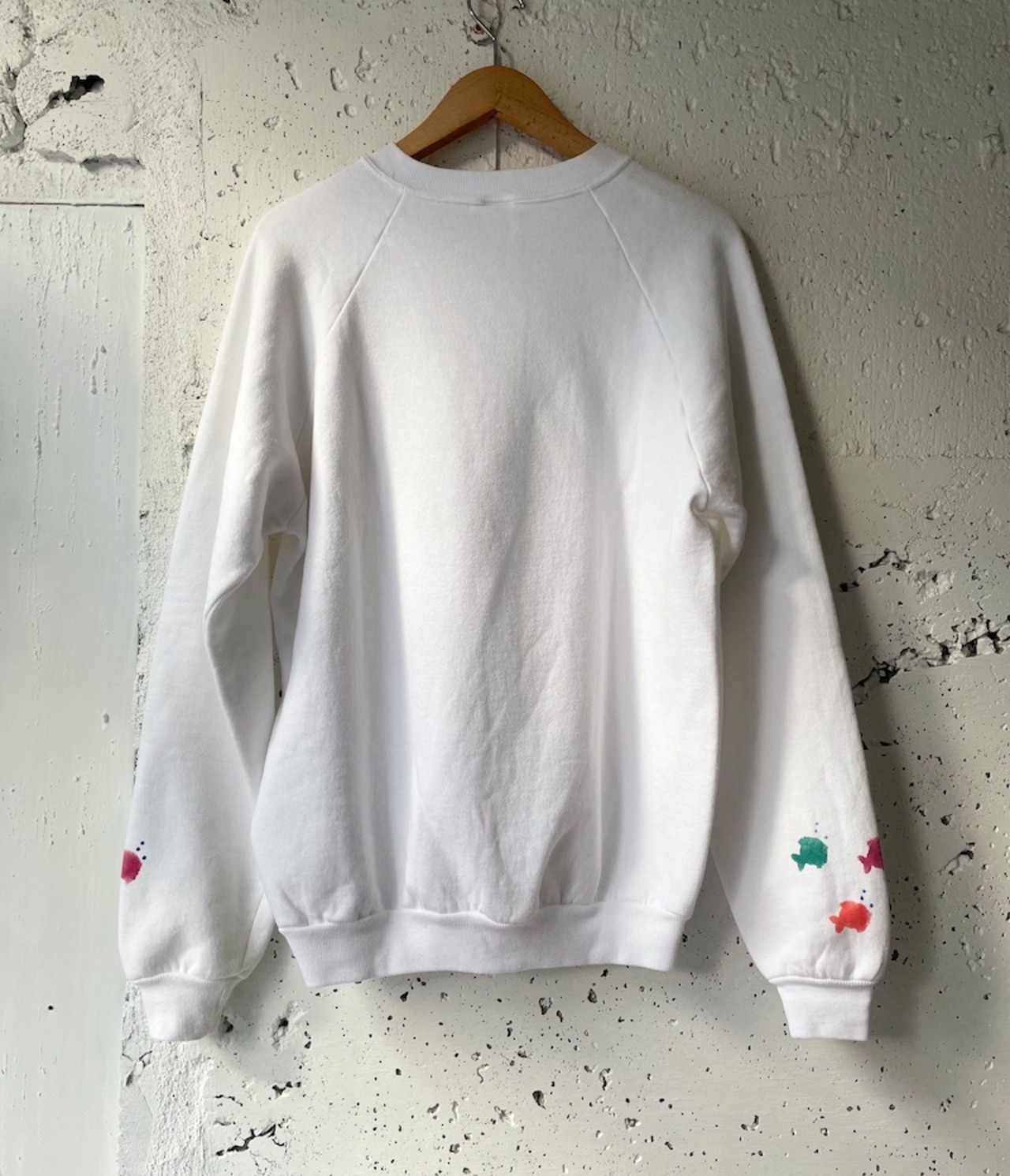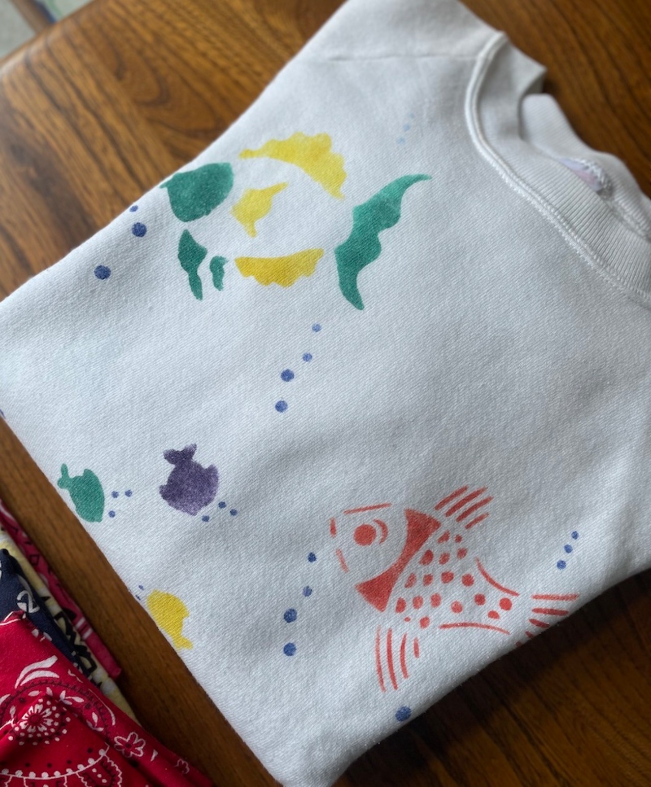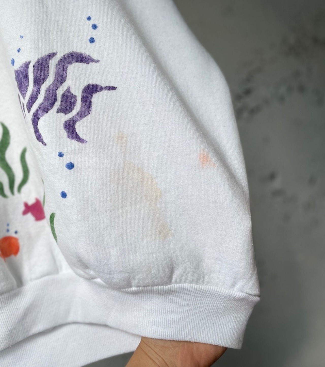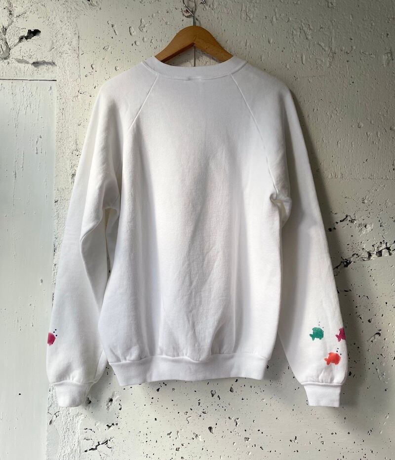 小学生の頃 国語で習ったスイミーの物語。なんとなくそれを彷彿とさせるようなプリントのスウェットです。ホワイトボディにあしらわれた海のようすは、もしかすると前の持ち主さんのDIYかも。ボディは80年代のJERZEES、USA製のスウェットです。あ!袖口にまでお魚発見!お魚と古着をこよなく愛する方に。