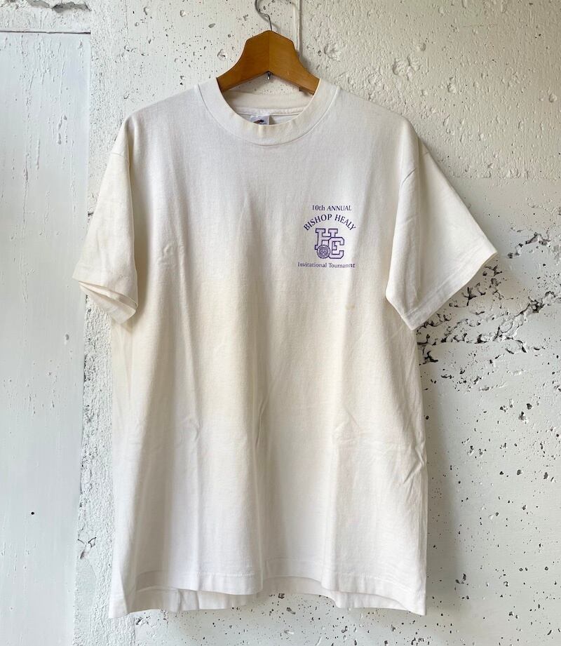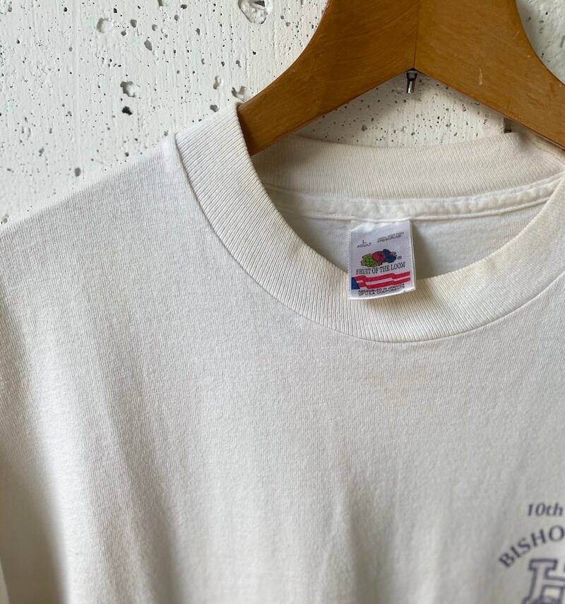 スピーチとかディベートの大会Tシャツ。たぶんビショップさんって方をお招きしてる大会なんでしょうね。高校生が出場する大会で、出場した学校の名前が背面にずらっと!この手のプリントで縦書き表記って意外とない気がして、面白いですね。ボディはFRUIT OF THE LOOM、USA製です。