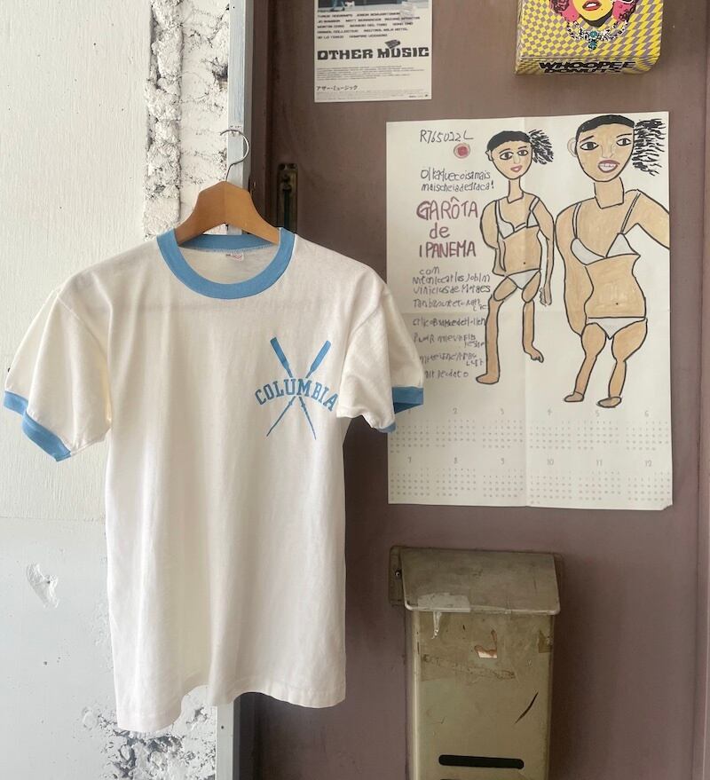 カレッジもののリンガーTシャツ。淡いライトブルーカラーは珍しいですし、可愛いですね。わさわさとなってしまうことが多いランタグは、バッチリ綺麗に残っています。ランタグというのは、スポーツウェアメーカー、Championの1960年代中期ごろに使われていたタグの通称です。人が走っているロゴから、ランタグと呼ばれています。表記サイズLで、縮みが入って実質M相当ってところでしょうか。ダメージほぼなし、GOOD なVINTAGE ITEM!是非お早めにどうぞ。