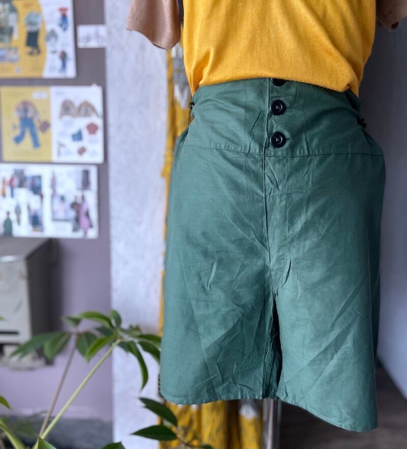 薄くて軽い、ミリタリーなグリーンの生地。フロントにはゴム製のような柔らかな弾力ある感触のボタンが3つ。ウエストのサイドにはボタンホールのような穴が2個ずつついていて、内側から付属のコードを通してきゅっとウエストを絞ることができます。このままだと絞ってもなおサイズが大きめだったので、当店のリペア担当スタッフに頼んで背面にゴムを入れてもらいました。結果、後ろ姿もキュートなことに!着ていてラクなので、部屋着にもよさそうですね。